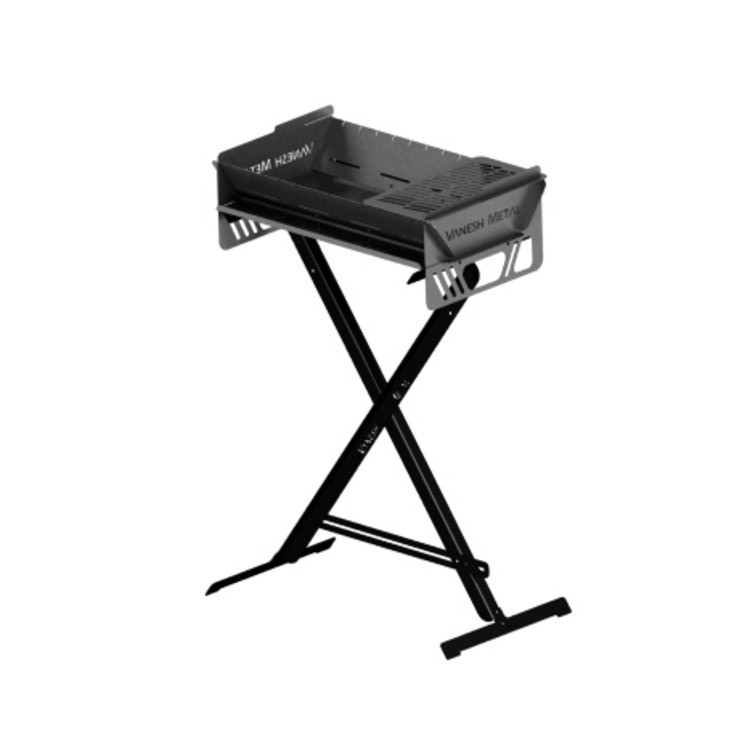 همچنین پایه این منقل ساختاری تاشو با قابلیت تنظیم ارتفاع را دارد تا کمترین فضا را برای حمل و جابجایی بگیرد و متریال به کار رفته از جنس ورق فولادیست تا تحمل بار مورد نظر را داشته باشد و دارای رنگ استاتیک می باشد تا دچار زنگ زدگی نشود ضمنا از این پایه می توان برای انواع و اقسام منقل ها نیز استفاده کرد.