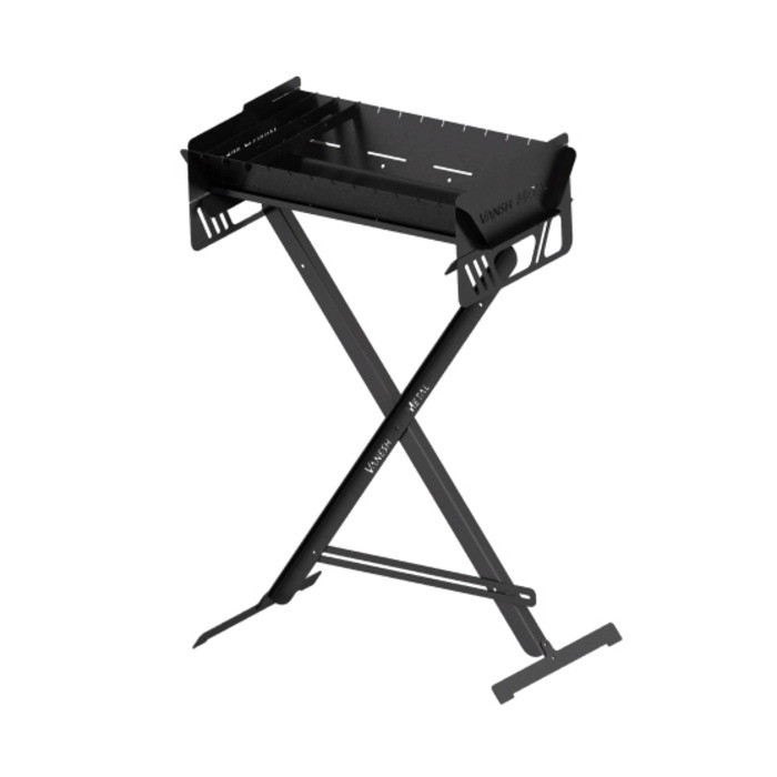 همچنین پایه این منقل ساختاری تاشو با قابلیت تنظیم ارتفاع را دارد تا کمترین فضا را برای حمل و جابجایی بگیرد و متریال به کار رفته از جنس ورق فولادیست تا تحمل بار مورد نظر را داشته باشد و دارای رنگ استاتیک می باشد تا دچار زنگ زدگی نشود ضمنا از این پایه می توان برای انواع و اقسام منقل ها نیز استفاده کرد.